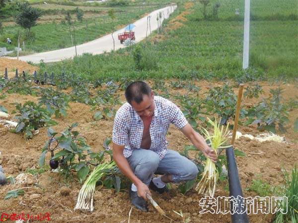 化新村村支书胡波在该村蔬菜园区里割韭黄