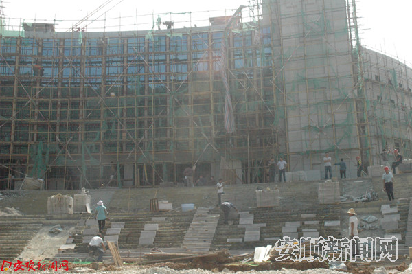 在综合文化中心入口处看到,图书馆、展览馆、博物馆和会议厅的综合文化中心主体建筑机构已经完成,一些工人忙着铺设地板砖,一些工人忙于内外墙装修和室内灯光、音响安装等。据该工程负责人金总介绍,由于上周连续下雨,部分工种不便于施工作业,近两天天气较好,他们120多位施工人员,采取轮班作业的方式,争取在9月6日前完成该项目建设工程。