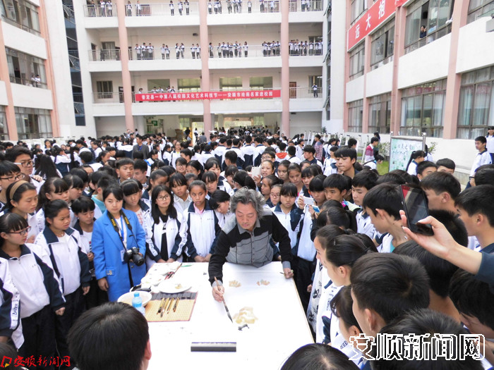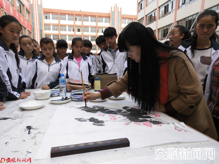 据了解,普定一中以开拓的精神和大胆的思路敞开校门办学,到今年已成功举办了8届校园文化艺术科技节。为了给学生们创造良好的学习氛围,提供良好的学习交流平台,第八届校园文化艺术节特别邀请了安顺知名油画家、国画家、肖像画家走进校园,在市美术家协会主席吴传双的带领下,吴思宇、谢朝玺、史贤琴、何谦、孙毅、洪惊涛、马仕祥、徐波、王林、黄新民、廖晓峰十余名安顺本土艺术家分别用作品表达了与校园文化的互动。