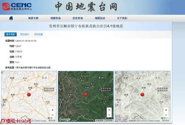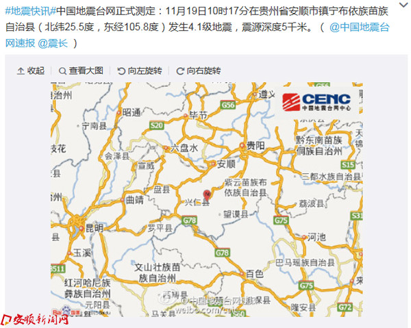 中国地震台网正式测定:11月19日10时17分在贵州省安顺市镇宁布依族苗族自治县(北纬25.5度,东经105.8度)发生4.1级地震,震源深度5千米。(来源 中国地震台网速报)
