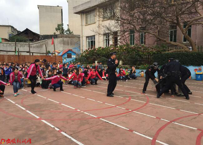 演练结束后,民警还向师生们进行了防暴演练,灭火处置,现场急救的展示,并通过现场教学指导的方式,对警用器械的使用和擒拿术向孩子们进行了一一讲解。
