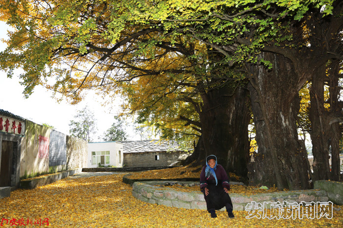 11月21日,西秀区蔡官镇茅蕉坡村罗大寨,矗立在村口南斗青龙寺前的古银杏树叶飘落,地面上一片金黄,犹如“黄金地毯”,十分壮观。