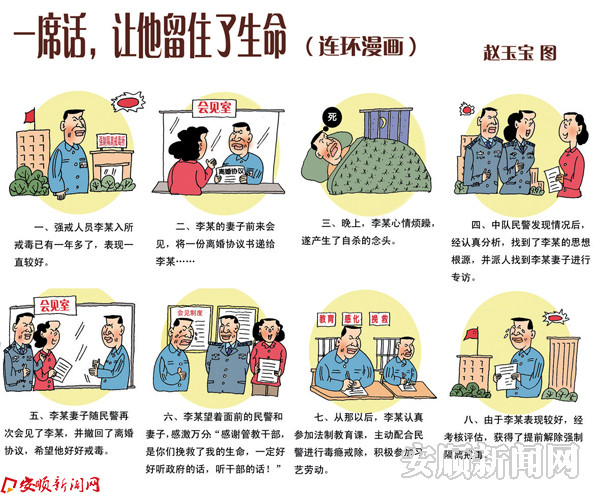 本网讯 日前,由中央电视台教育频道、中国图书馆学会、中国新闻漫画研究会、天津市文化广播影视局、中共天津市和平区委、天津市和平区人民政府联合举办,和平区文化和旅游局、和平区少年儿童图书馆承办的和平枫叶杯全国连环画创作大赛揭晓,贵州省安顺强制隔离戒毒所政治处副主任赵玉宝创作的戒毒连环漫画《一席话,让他留住了生命》获入围奖。