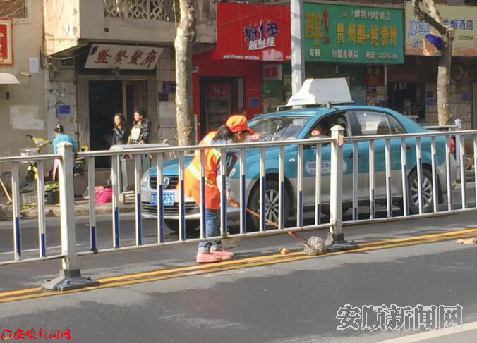 记者在安顺街头走访发现,马路中央随处可见正在清扫的环卫工人。他们穿着反光衣,很多环卫工边清扫边不时抬头看看车辆驶来的方向。很多车辆遇到环卫工纷纷减慢速度或绕行,而少数车主则不耐烦地按喇叭,示意环卫工人让路。