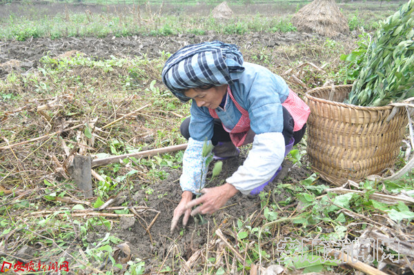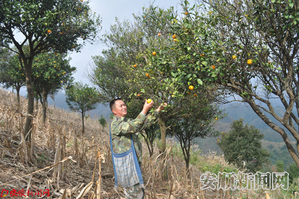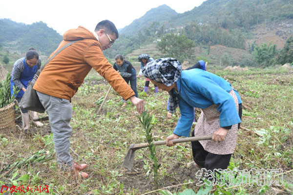 在打帮乡广益村龙广组,海拔只有500余米的坝嗄槽子里,满山遍野都是忙着栽种黄果种苗的村民。“乡亲们,每株树苗要间隔2米,不要种得太密了,来拿这根竹杆去一边种一边量吧。”打帮乡财政所的闵加海大声喊着。“冬种果树,夏插秧,为了赶种植季节,我们昨晚连夜到晴隆去拉改良的黄果树苗,大雾弥漫,车速不能快,晚上十点多钟才赶回乡里。今天一大早就来发树苗,到现在已发出8000余株了。”中午十一点左右闵加海一边工作一边告诉记者。