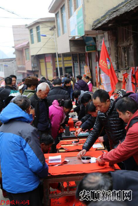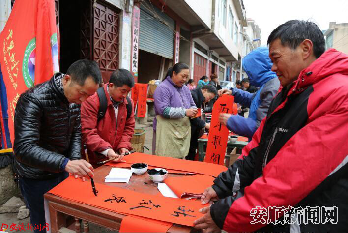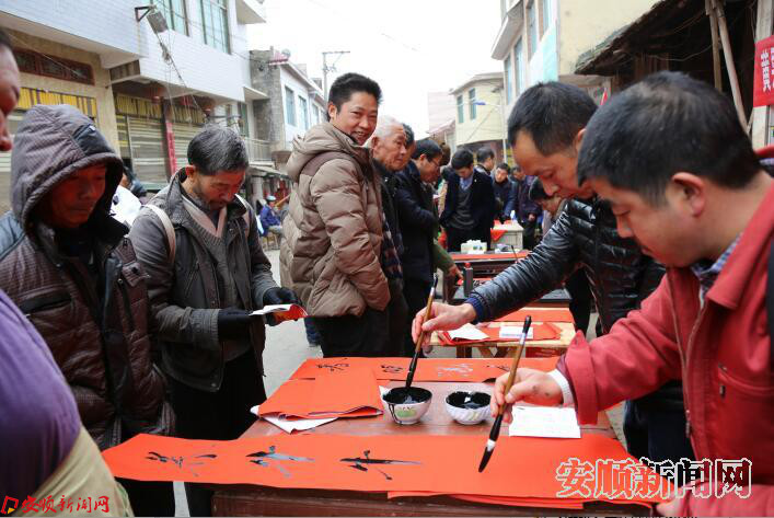 为丰富全区乡村文化生活,做好春节期间群众文化活动工作,让村民度过一个欢乐祥和的节日,营造喜庆温馨的传统文化氛围,黄果树风景名胜区组织书法爱好者深入到赶集场坝开展迎新春写春联送春联活动。