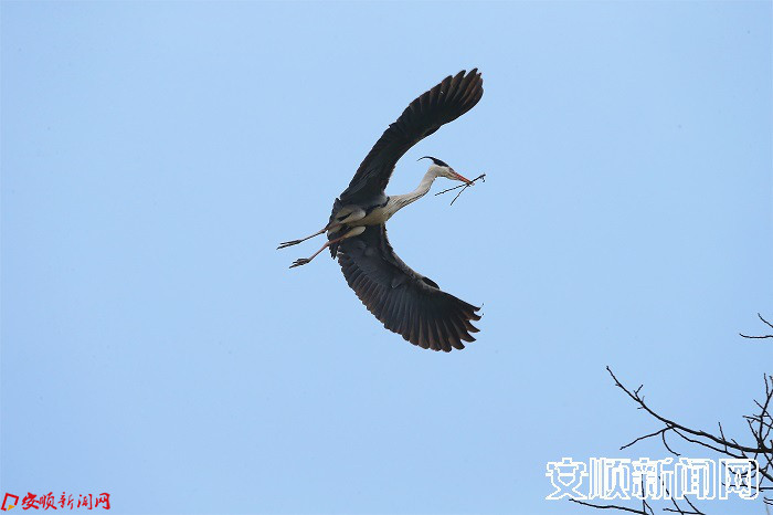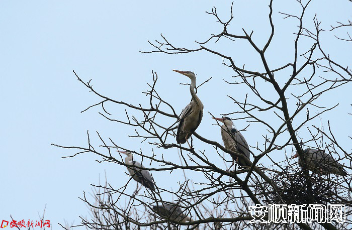 一进村口,抬头便见十余只大鸟上下翻飞,衔木筑巢,鸟身呈白色,翅膀呈灰色,翼端浅蓝,鸟嘴浅黄, 甚是引人注目。
