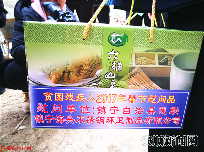 本网讯 近日,镇宁县委县政府开展春节慰问贫困残疾人家庭活动,150户残疾人家庭每户慰问物资20斤优质面条,这是镇宁海星不锈钢环卫制品有限责任公司提供的“爱心慰问品”。