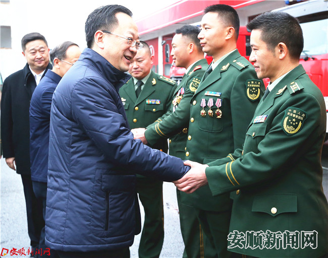 曾永涛、陈训华一行首先来到市消防支队,消防官兵们精神抖擞,队列整齐,口号嘹亮。曾永涛首先向官兵们致以节日问候,对他们在消防安全、应急救援、防汛抗灾、维护社会和谐稳定方面做出的贡献表示感谢。他说,多年来,全市广大消防官兵坚持听党指挥,服务人民,英勇善战,在急难险重任务面前冲锋在前、舍生忘死,以实际行动捍卫了人民生命财产安全,展现了党和人民忠诚卫士的光辉形象,赢得了人民群众的广泛赞誉。希望大家要继续发扬部队的光荣传统和优良作风,用辛苦指数换来群众的幸福指数、安全指数,闻鸡起舞,登高望远,撸起袖子加油干,努力在建设富美新安顺的征程中再创佳绩、再立新功,同时希望大家坚守岗位,不辱使命,做好节日期间消防安全工作,确保人民群众过一个欢乐、祥和、平安的春节。