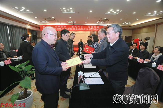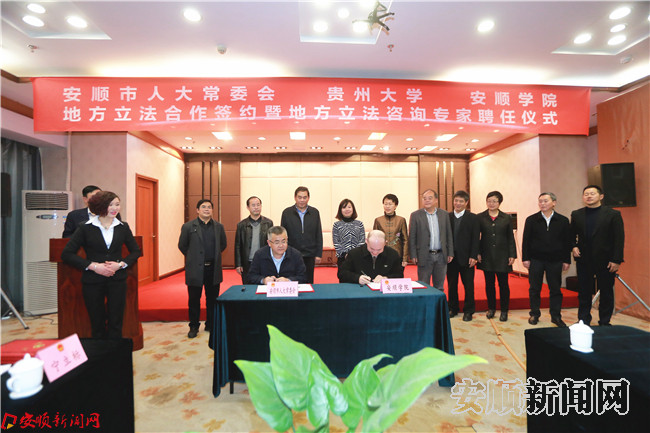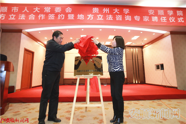 仪式上,出席市领导向受聘地方立法咨询专家代表颁发聘书,市人大常委会分别与贵州大学、安顺学院签订地方立法合作框架协议,并为“贵州大学法学院地方立法研究与实践基地”揭牌。