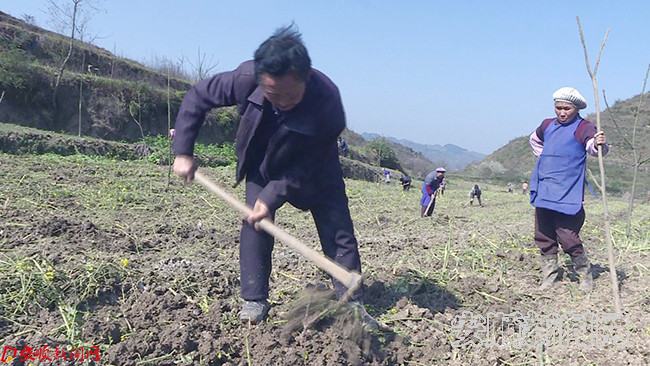 在关岭自治县顶云街道办事处新场村,该村党支部副书记王建龙正挥锹填土,带领群众赶着春耕春种好时节发展猕猴桃种植。已是60多岁的王建龙干起活来依旧毫不含糊,干劲十足。王建龙兴高采烈的说:“我们总共栽400亩,已经栽了三天,今天栽了100多亩了。”