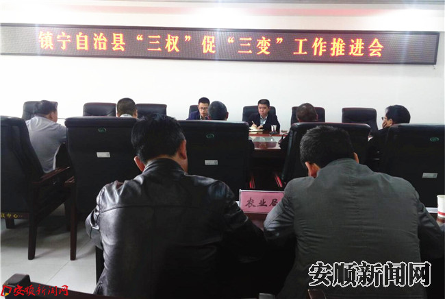 本网讯 为推进镇宁自治县县“三权”促“三变”改革工作,加快“三权”促“三变”观摩点的建设,镇宁自治县2017年4月18日下午3:00时,在县文体活动中心三楼会议室召开镇宁县“三权”促“三变”工作推进会,参加会议的有县委常委、马厂镇党委书记杨猛、县农业局局长张志荣、相关成员单位、各“三权”促“三变”观摩点涉及乡(镇、街道办)主要领导、分管领导、具体负责人等。