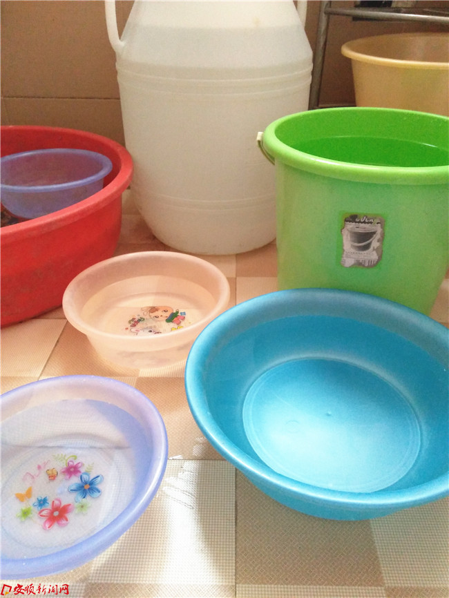 4月22日下午3点,安顺中心城区的体育宿舍、运管所宿舍、安吉小区等部分宿舍小区已听不到水龙头的哗哗流水声,各家各户提前准备好的水此时变得异常珍贵。“13日听到要停水之后,21日就已经开始准备接水存着了。听说要停三天,还怕家里水缸里的不够用,就把能装水的容器都用上了。”在市民范女士家的家里,大到塑料水缸,小到漱口杯子,几乎能盛水的容器都装上了清水,范女士一家对于这次的停水可算做了一番不小的准备。能用的容器都用上了,周女士觉得如果要停水自家的水对生活不会造成影响。