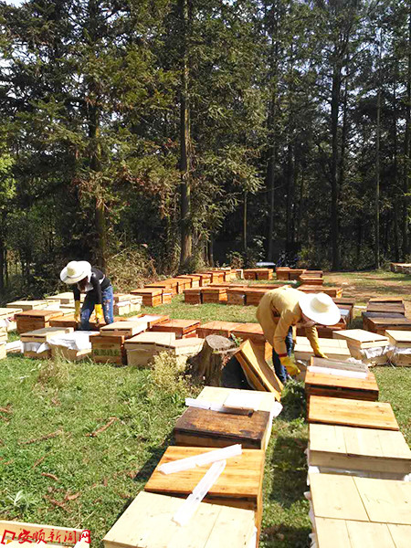如今,50箱蜜蜂已拉到村里,到普定夜郎蜂业公司学习管理技术的5名村民在周末回来参加管理,普定夜郎蜂业公司的技术员也定期上门指导,如今蜜蜂养殖欣欣向荣。
