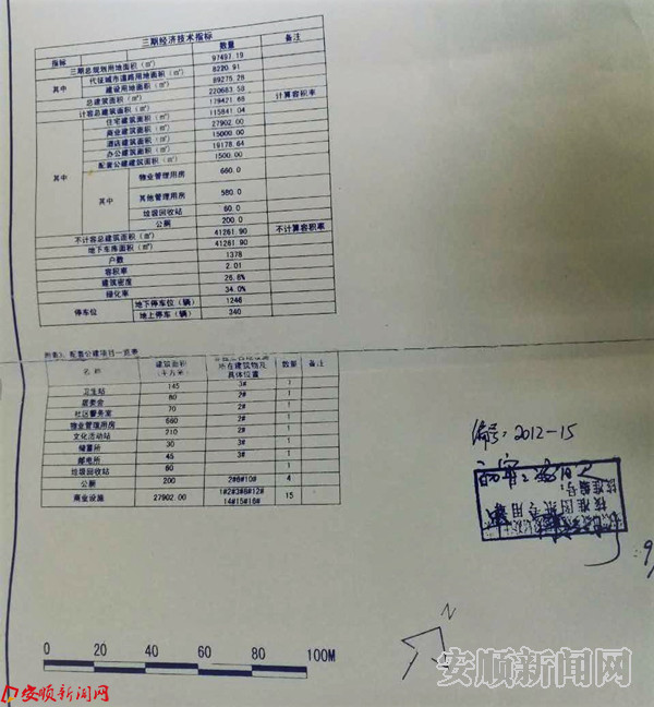 随后,记者查看了规划图纸,图纸上有规划部门2012年的核准盖章。该图分为“三期经济技术指标”和“配套公建项目一览表”,其中,停车位规划部分明确标注地上车位为340个。
