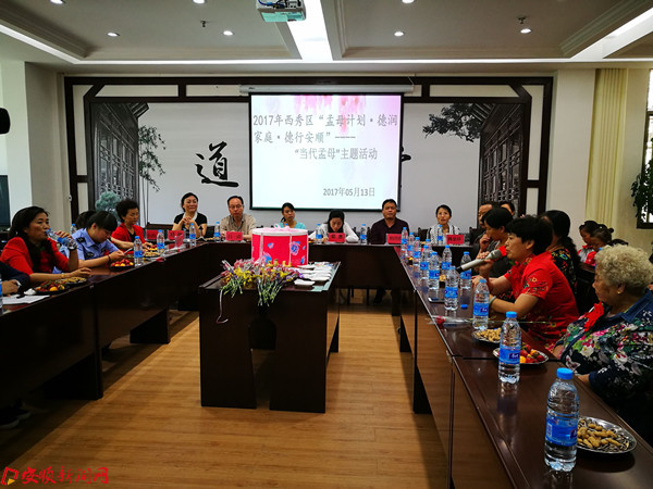 在服务中心二楼会议室,一场别开生面的会议正在举行,社区邀请了十名母亲共同参加“孟母计划.德润家庭.德行安顺”座谈会。来自黄果树公证处的顾新红女士动情地讲述了母亲抚育她家七个兄弟姐妹的艰辛与不易,还有母亲传承下来的良好家风;社区女警官李燕琼说起自己如何培养年幼孩子的果敢与坚毅的过程,交流与分享赢得大家的掌声。座谈会上,“优秀兵妈妈”有事不能到场,而其丈夫、下岗工人张功武则向大家讲述妻子与他如何培养儿子从小勤俭吃苦与孝顺,儿子如何成为一名优秀军人的故事……座谈会上,大家对关于母爱、关于未成年人教育及家风家训的话题,踊跃发言,气氛轻松而热烈。