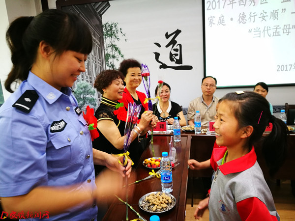 座谈会上,社区表彰了“兵妈妈”蒋玉娟、“热心妈妈”马翠英、“孝心妈妈”鲍小玲、“爱心妈妈”陈德慧、“警花妈妈”李燕琼10名优秀母亲获得“当代孟母”荣誉,领取了纪念品,并接受辖区小朋友送上的康乃馨。