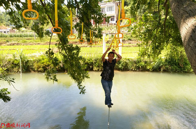 当日,记者在松山街道办主任李武伟的带路下走进枫香村,村子的多个路口两边都摆放着有粗钢管做柱子废旧轮胎作花盆的简易花桩,横穿枫村子的河道上新修了几道拦河坝,清澈水面上安装有吊桥、趣桥、栈桥、浮桥等,这些桥有的的绳子和模板搭成,有的是铁杆和木方搭成,有的是废弃轮胎和绳子搭成,既好玩又惊险。