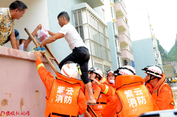 为尽快撤离群众,消防官兵在住户阳台上架设疏散楼梯,然后引导被困群众安全撤离。目前,该地段水位已退,群众日常生活逐渐恢复正常。(紫云自治县消防大队 吴知望)