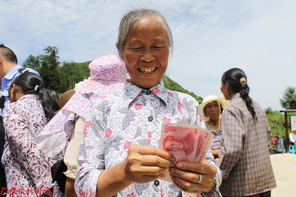 “太高兴了,今天领到这么多工资,想都没有想到。”今年67岁的陈学敏与同村人一起,从蔡官镇赶到轿子山镇郭家屯村的合作社务工。干了17天,她拿到995元,领到钱后,她反复的数着一张张百元钞票,露出灿烂的笑容。