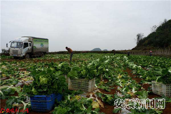 本网讯 深冬的清晨,冷风刺骨,在西秀区蔡官镇对长沙蔬菜种植基地里,村民们却无惧严寒,喜笑颜开地收割着大白菜,一筐筐绿油油的大白菜整齐摆放在路边,旁边打着“绿野芳田”字样的货车正等待装车。