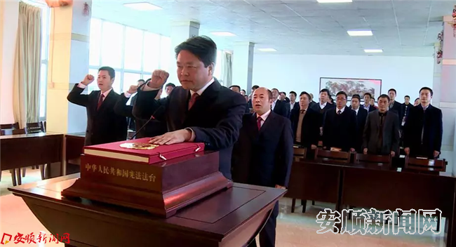 揭牌前,普定县监察委员会新当选的县监委副主任、委员对着宪法进行庄严宣誓。