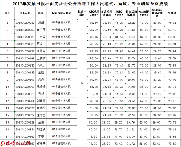 《2017年安顺日报社面向社会公开招聘工作人员》面试、专业测试工作已结束。现就面试、专业测试成绩及总成绩等有关事宜公告如下: