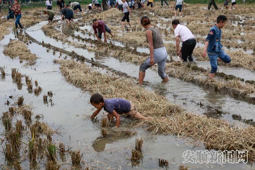10月1日,游客在安顺市平坝区白云镇体验农耕生活活动上体验抓鱼