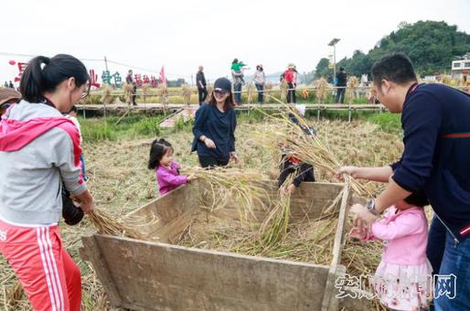 10月1日,游客带孩子体稻谷收割