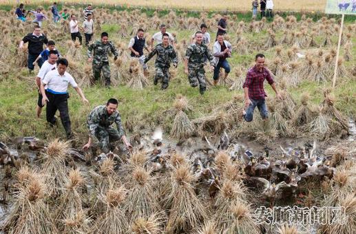 10月1日,游客在安顺市平坝区白云镇体验农耕生活活动上抓鸭子