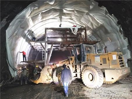 往前的紫云隧道,隧道双向车道已打通,十余位工人正在进行隧道内二衬(稳固)施工作业。