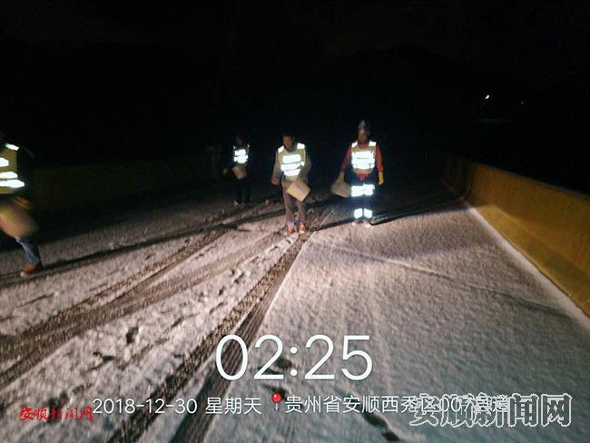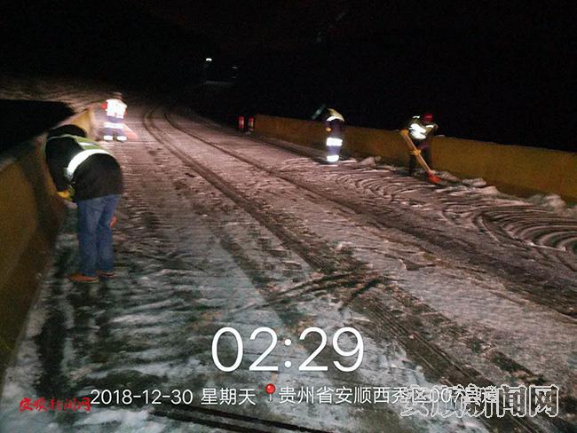 12月30日凌晨12时至3时,在巡查中发现龙宫区域路段有结冰现象,立即派遣防凝冻应急队到道路铲除道路冰块、撒工业盐。目前道路已全面畅通,可保持慢行。