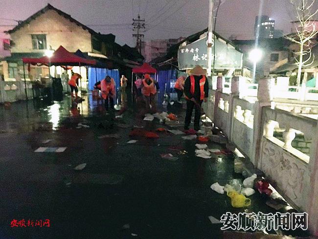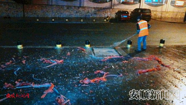 凌晨零时,炮竹声响彻后,燃放后的烟花随处可见,环卫工人全面出击,挥着扫帚清扫着,忙个不停。青山中转站、中心城区10余个垃圾收集点灯火通明,垃圾运输车一辆接一辆压缩、中转,不留存积。驾驶员娴熟地装载、倾倒垃圾,不敢有一丝懈怠。西秀区七个环卫所、保洁服务中心、处置中心、直属中队等10个基层部门一同通宵加班,同甘共苦。