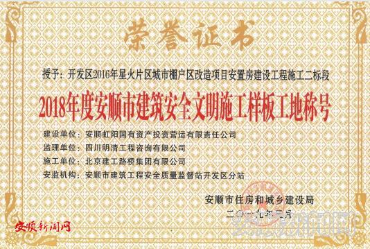 3月21日,记者从星火片区棚户区改造项目部获悉,经开区星火片区安置房二标段于近日获得省住建厅授予的“2018年度贵州省建筑安全文明施工样板工地”及市住建局授予的“2018年度安顺市建筑安全文明施工样板工地”双项荣誉称号。