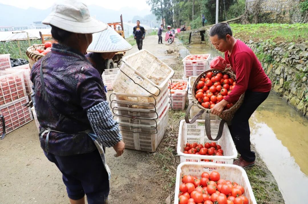 初冬入永睦,百亩提子园叶落萧瑟,已见枯黄,西红柿基地却青红相错,生意盎然。农户们将红透的果实一一摘下装进竹篓背到路边,从贵阳而来的蔬菜收购商兰林兵,早已等候多时,采摘、装货、称重、上车,各个流程一气呵成。