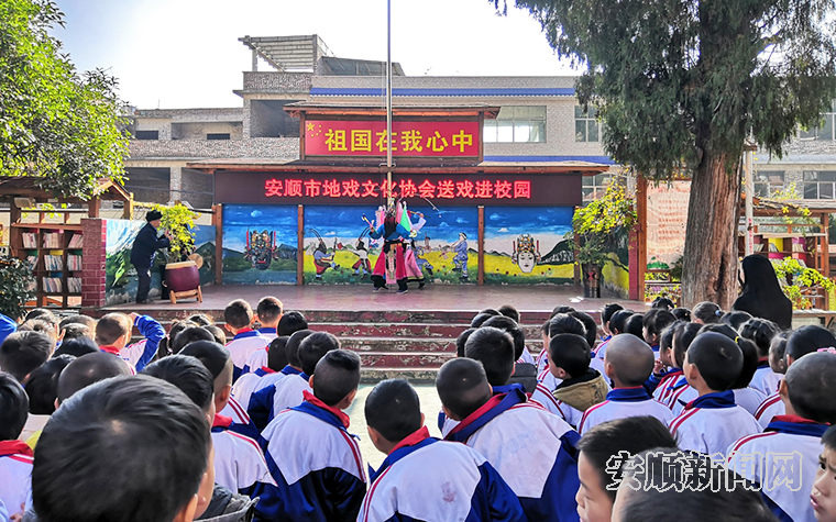 近日,安顺市地戏文化协会 “百堂地戏”进校园活动正式启动。活动第一站由安顺市地戏协会推荐小呈堡地队参加共青团黄果树旅游区团委公益活动义演。由民间地戏演员陈国四带队,于12月16日上午10:30在龙宫镇蔡官小学,为全校师生表演地戏《五虎平西》之石玉大战土天虎五拾回合。通过表演让同学及老师们零距离感受到地戏传统文化的魅力。小呈堡地戏队员的精彩表演获得了全校师生的称赞。(安顺日报社大数据智慧全媒体记者 武贵琼)
