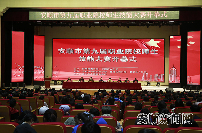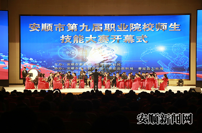 12月18日,安顺市第九届职业院校师生技能大赛开幕式在普定县中等职业学校举行。来自全市各县区教育局分管副局长、业务科室负责人,全市各职业院校班子成员,2019年省赛、国赛中获奖代表,全市各初中学校校长,普定县中等职业学校师生代表共计1000余人参加开幕式。