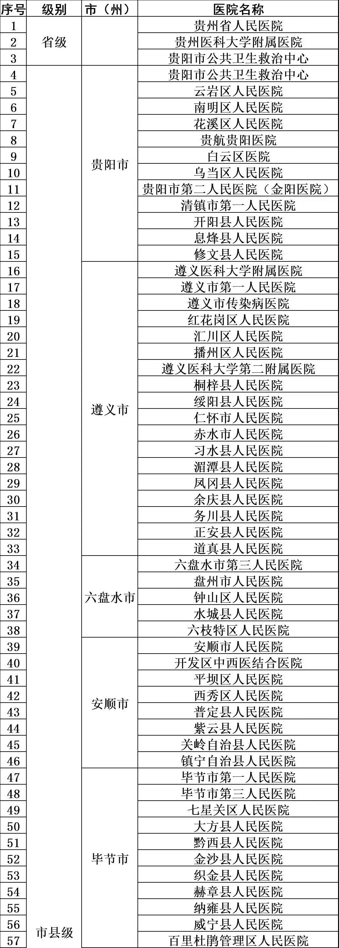 为做好全省新型冠状病毒感染的肺炎医疗救治工作,卫生健康部门根据各地医疗资源情况,明确贵州省人民医院等108家医院为新型冠状病毒感染的肺炎定点救治医院,收治确诊病人、疑似病人,现予以公布。贵州省卫生健康委将根据需要适时调整定点救治医院。