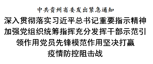 1月28日,中共贵州省委发出《关于深入贯彻落实习近平总书记重要指示精神坚决打赢新型冠状病毒感染的肺炎疫情防控阻击战的紧急通知》,要求全省各级各部门深入贯彻落实习近平总书记重要指示精神,加强党组织统筹指挥,发挥领导干部示范引领和党员先锋模范作用,团结带领广大人民群众坚决打赢疫情防控阻击战,让党旗在防控疫情斗争第一线高高飘扬。
