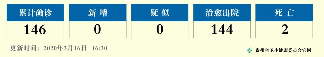 2020年3月16日0—12时,全省新型冠状病毒肺炎无新增确诊病例,新增治愈出院病例1例(贵阳市1例)。