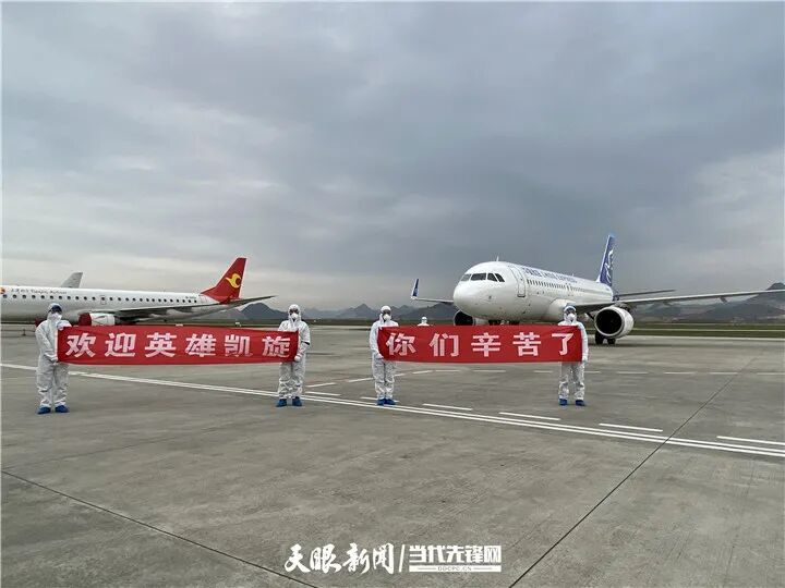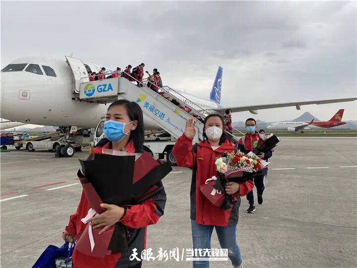 据了解,上午9点30分,贵州省援鄂医疗队分别搭乘华夏航空G59058、G59061准时从武汉天河国际机场出发,飞行1小时30分后,213名队员顺利归来。
