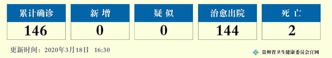 截至3月18日12时,全省累计报告新型冠状病毒肺炎病例146例。其中,51例有武汉旅居史,14例有武汉外湖北其他地区旅居史,15例有湖北以外地区旅居史;治愈出院144例,在院治疗0例,死亡2例;男性74例,女性72例;年龄最大87岁,最小1个月(确诊时间);贵阳市36例(治愈35例,死亡1例),遵义市32例(治愈32例),六盘水市10例(治愈9例,死亡1例),安顺市4例(治愈4例),毕节市23例(治愈23例),铜仁市10例(治愈10例),黔东南州10例(治愈10例),黔南州17例(治愈17例),黔西南州4例(治愈4例)。现无疑似病例。