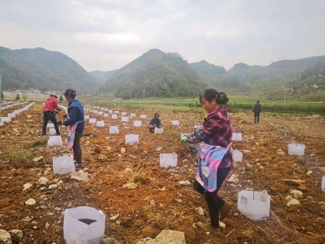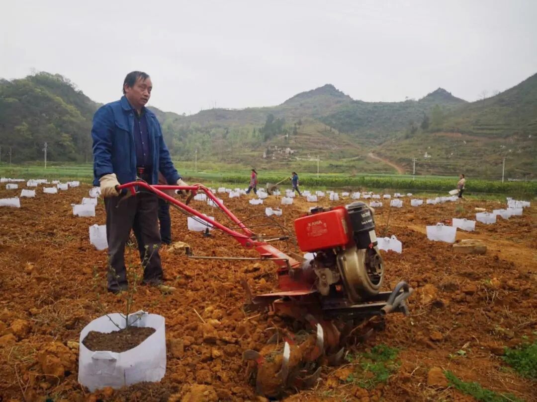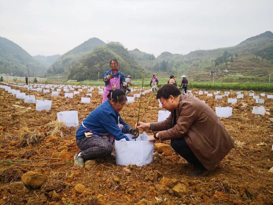 几十位村民正在为刚刚移栽的山苍子小树苗培土。一个精干的男子正在指导他们:“树苗上的叶子一定要摘掉,土一定要放到根部上面10厘米左右的位置……”。