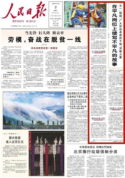 5月2日,《人民日报》头版刊发文章《在平凡岗位上续写不平凡的故事!“五一”假期,广大劳动者保持干劲、贡献力量》,其中介绍了贵州省盘州市的大山深处,150多名工人正在高空紧张施工。