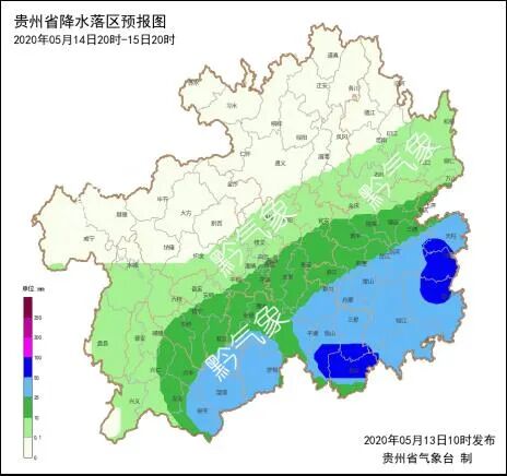 14日夜间到15日白天,省的中南部地区阴天有阵雨或雷雨,雨量中到大雨,其中黔东南州中南部、黔南州南部部分乡镇有暴雨,安顺市南部、黔西南州东部、黔南州、黔东南州局地伴有冰雹、大风、短时强降水等强对流天气,其余地区多云;