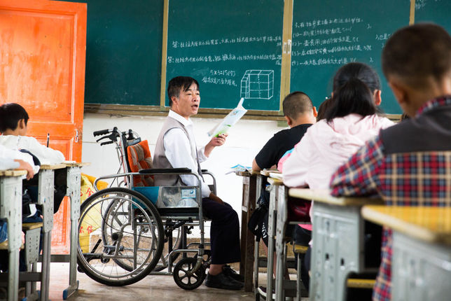 站不起来,仅能用左手,张家嵩连黑板都够不着。“不能站着,我可以坐着讲。够不着黑板,我可以拿竹竿指给学生们看。”张家嵩语气坚定。