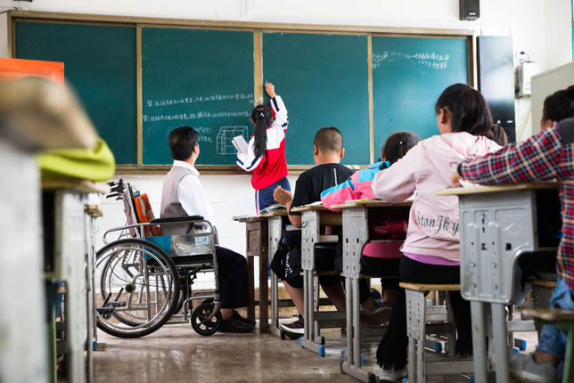 拿着张家嵩提前写满教学内容的小纸条,“小助教”工整地抄写在黑板上。坐着轮椅,左手拿着一根细长的竹竿,张家嵩指着黑板详细讲解。