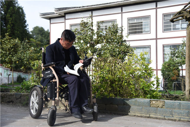 春日午后,阳光洒在大方县菱角村菱角小学教学楼前,张家嵩坐在轮椅上,拿着一本小学数学课本,眉头紧锁,逐页翻看。阳光照得他的脸红扑扑的。