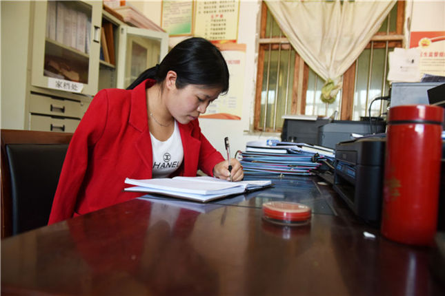 张兴燚在村委会办公室整理脱贫攻坚材料(2019年3月21日摄)。新华社记者 杨文斌 摄