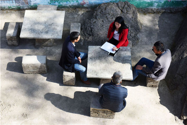 张兴燚(后)与村民们讨论村里修建蓄水池的相关事宜(2019年3月21日摄)。新华社记者 杨文斌 摄